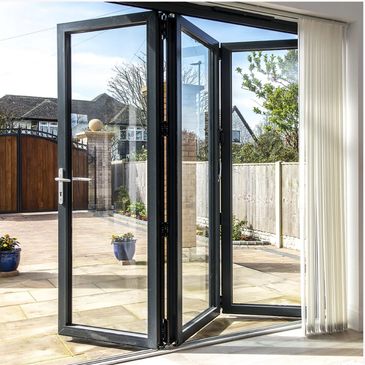 Bi-folding doors have rapidly become one of the most popular choices for domestic homes. Bi-folding doors work in a consertina principle, folding and sliding into a compact stack. Opening up the entire doorway, they can be fabricated to open in or out depending on the space that you have available. They are usually configured with one lead trafic door used like a standard conventional door. All of our bi-folds are made from aluminium and are available in a range of colours. We install smarts visofold.